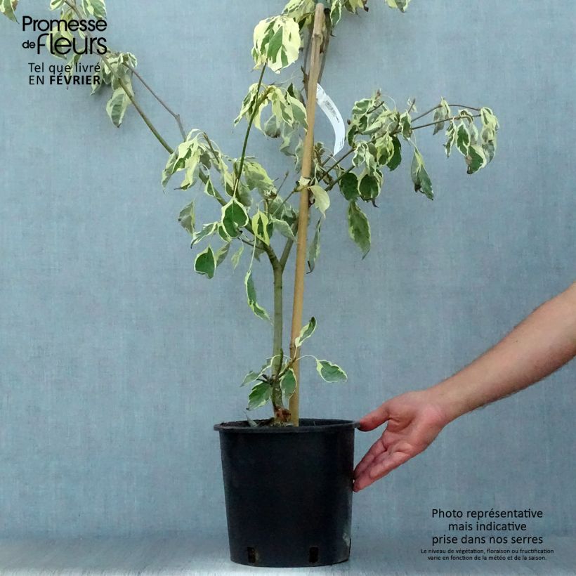 El Cornus controversa Variegata, también conocido como cornejo de mesa variegado, es un pequeño árbol caducifolio que parece sacado directamente de un sueño. Su silueta de ramas escalonadas se viste con un follaje brillante, ampliamente abigarrado de crema, que en verano se cubre de capas nevadas, fragantes, tejidas con inflorescencias aplanadas, seguidas de frutas azul-negras y brillantes. Su follaje otoñal se tiñe de tonos rojos a violáceos antes de revelar, cuando llega el invierno, la arquitectura perfecta de su ramaje. Con el tiempo, y con elegancia, impone su presencia y merece que se le reserve en el jardín el lugar de una obra de arte, en un suelo fresco sin demasiado calcáreo.