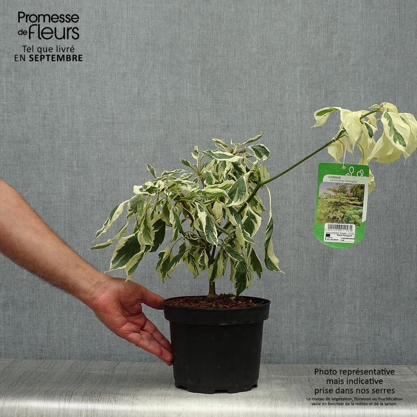 El Cornus controversa Variegata es un cultivar abigarrado procedente de un pequeño árbol originario, como si fuera obvio dada su apariencia extremadamente refinada, de China, Corea y Japón. Desarrolla al mismo tiempo una flecha vertical y ramas escalonadas, horizontales, hasta alcanzar lentamente los 7 a 8 m de altura con una envergadura de 6 m. Sus jóvenes ramas rojizas están cubiertas por un follaje verde profundo marginado de crema y blanco, muy venoso y brillante, siendo más claro en el envés, de tonos grisáceos a azulados. Es el único cornejo, junto con Cornus alternifolia, que muestra hojas alternas y no opuestas. Son hojas elípticas, ovales, con un extremo puntiagudo, recorridas por aproximadamente 8 venas paralelas, y miden 10 cm de largo. El follaje se vuelve de un rojo oscuro en octubre y permanece flamboyán en el árbol antes de caer. Si es magnífico al final de la temporada, su floración de mayo a junio en cimas aplanadas blancas es muy ornamental. Los grandes racimos perfumados que forma, de 10 a 15 cm de diámetro, iluminan el árbol mientras resaltan su porte tan original. La floración es seguida por la formación de bayas azul negruzcas de 1 cm de diámetro.