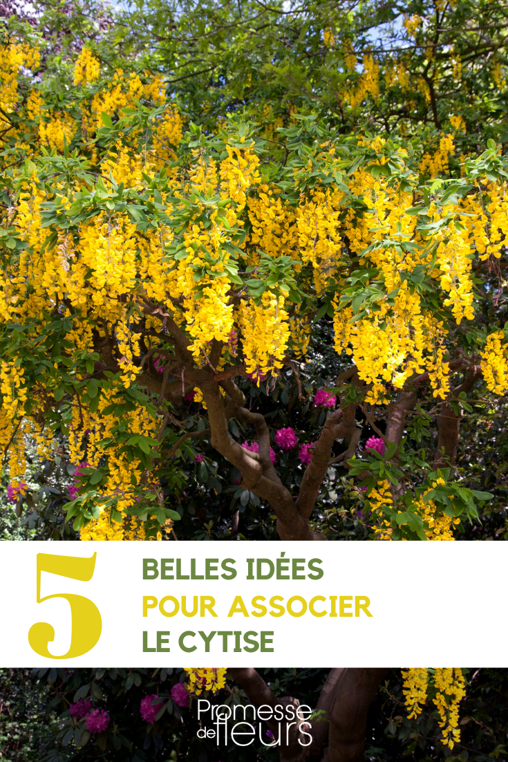 Los Cytises o Laburnum son grandes arbustos caducos de crecimiento rápido y muy resistentes. Toleran el tipo de suelo y crecen muy bien en suelos pobres, bien drenados y calizos, aunque, por supuesto, también aceptan condiciones más favorables. Arbustos de sol, pueden desarrollarse igualmente a media sombra. Se valoran por su abundante floración melífera y aromática, en ramos colgantes de color amarillo, lo que hace que a veces se les llame las ‘glicinias amarillas’. La mayoría se conduce en arbustos de varios troncos, y algunos jardineros aprovechan la flexibilidad de sus ramas jóvenes para poner en espaldera. Así, pueden conducirse como trepadoras para adornar con romanticismo una estructura o convertirse en la pieza central de un macizo, atrayendo todas las miradas. Su colorido franco y enérgico puede parecer difícil de combinar a primera vista, pero se pueden utilizar muchas plantas compañeras para crear composiciones bonitas, tanto si elige jugar con los camaieus como si prefiere los contrastes y los colores complementarios. Por eso, le propongo descubrir 5 ideas de combinaciones para resaltar un Cytise, independientemente del uso que desee darle en el jardín.