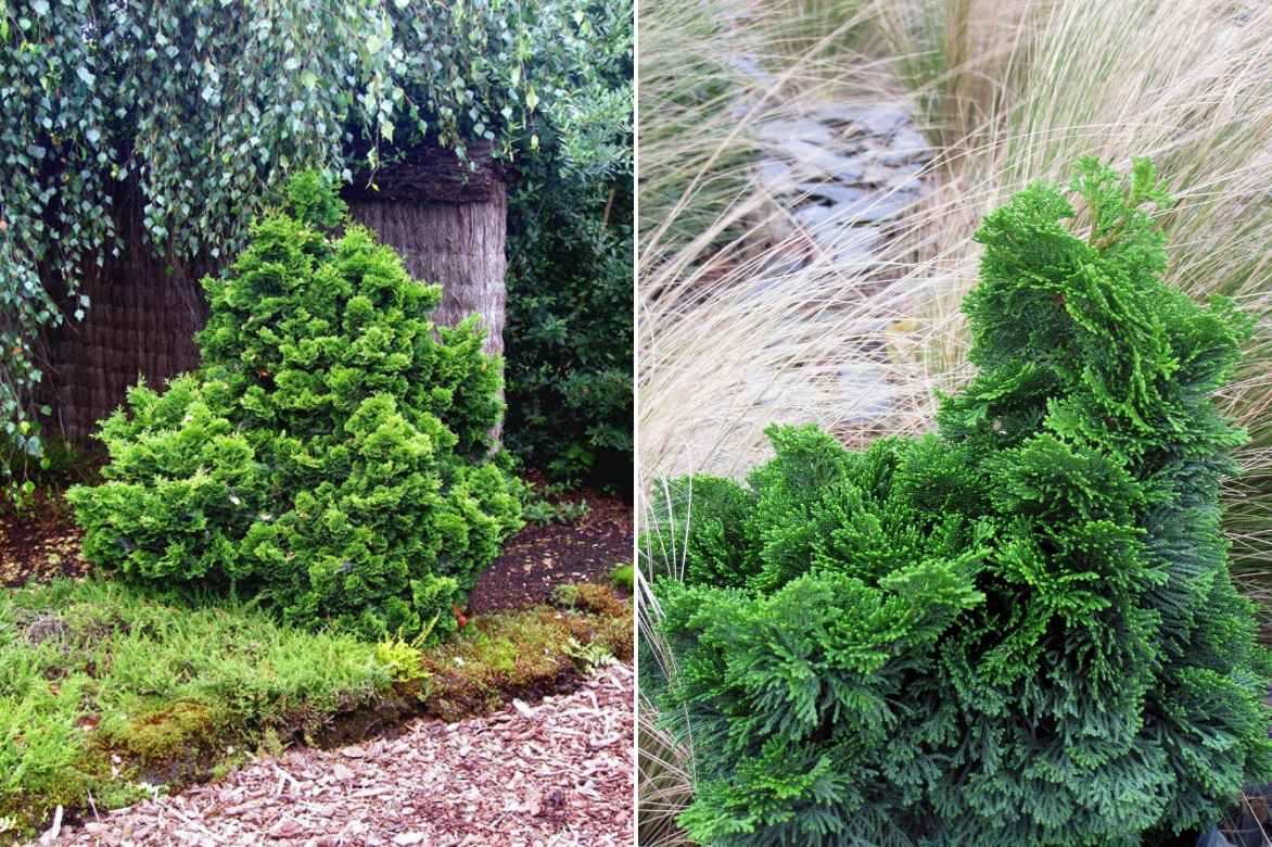¡Atención a las numerosas variedades de Chamaecyparis vendidas como «Coníferas de rocalla»: debido a su crecimiento lento de aproximadamente 1 m en 10 años, a veces alcanzan una altura de 4–5 m al cabo de 20–25 años! No se deje influir por la forma miniatura de las plantas jóvenes; verifique bien las dimensiones a madurez de su planta.