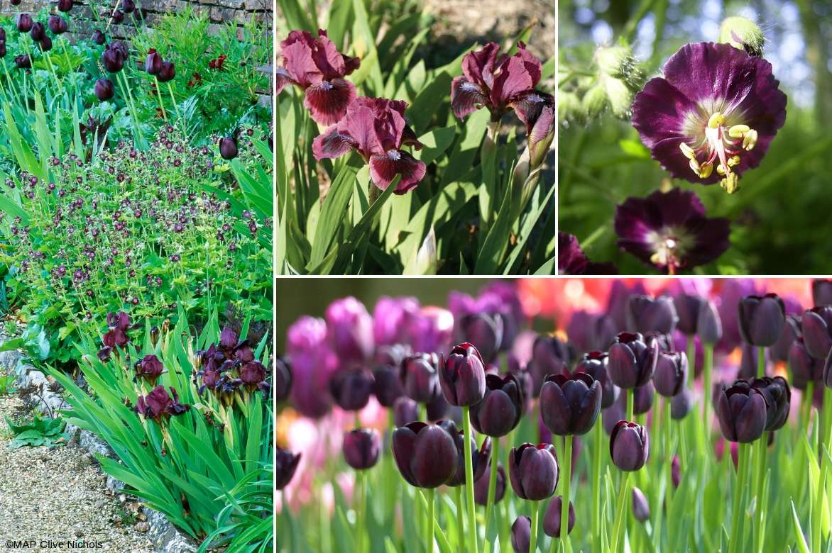 Un ejemplo de asociación monocromática: Iris germanica ‘Cat’s Eye’, Geranio phaem, Tulipanes ‘Queen of Night’ a las que puedes añadir Tulipanes ‘Black Parrot’Mezclar las variedades de iris de los jardines entre sí permitirá prolongar la floración.