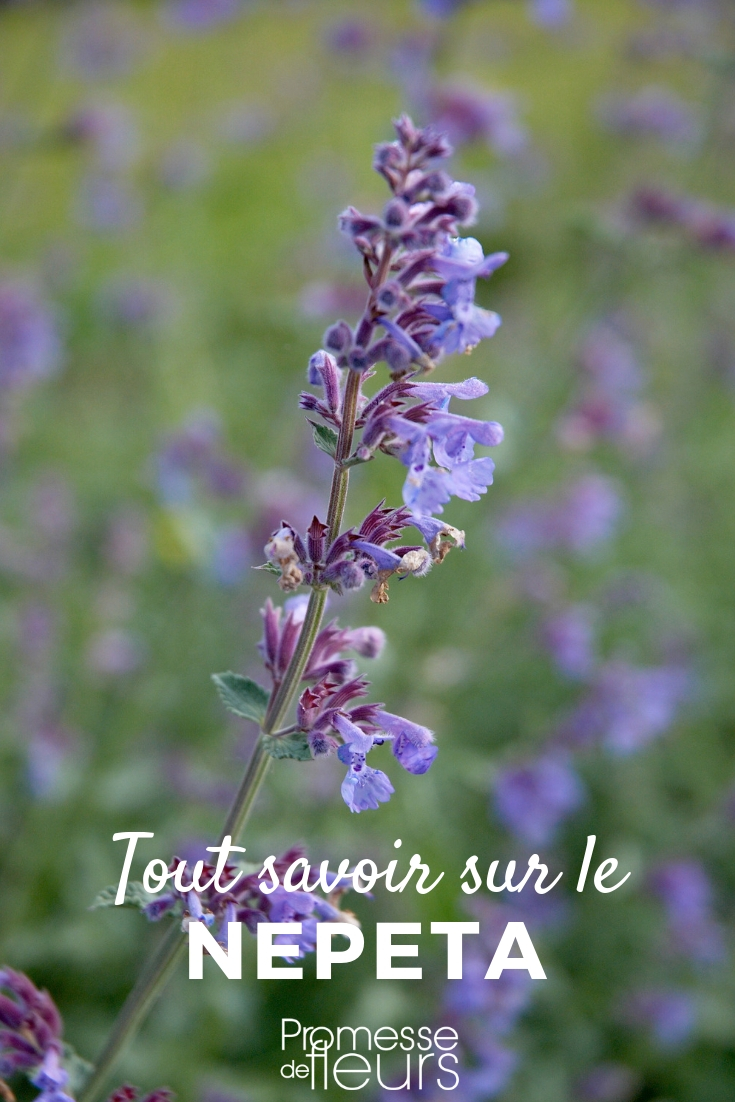 Le népéta possède des fleurs tubulaires, qui se divisent en deux lèvres, et qui sont assez caractéristiques de la famille des Lamiacées. La lèvre supérieure est petite et constituée de deux lobes, tandis que l’inférieure est plus large, bien développée, et compte trois lobes. Le calice comporte cinq dents (cinq sépales soudés). À l’intérieur du tube de la corolle, la fleur possède quatre étamines, qui portent le pollen. La taille des fleurs est assez variable : celles du Nepeta faassenii mesurent moins d’un centimètre de long, tandis que celles du Nepeta ‘Souvenir d’André Chaudron’ mesurent hasta 4 cm de longueur. Lorsqu’ils sont petits, la floraison prend un aspect très vaporeux et léger !