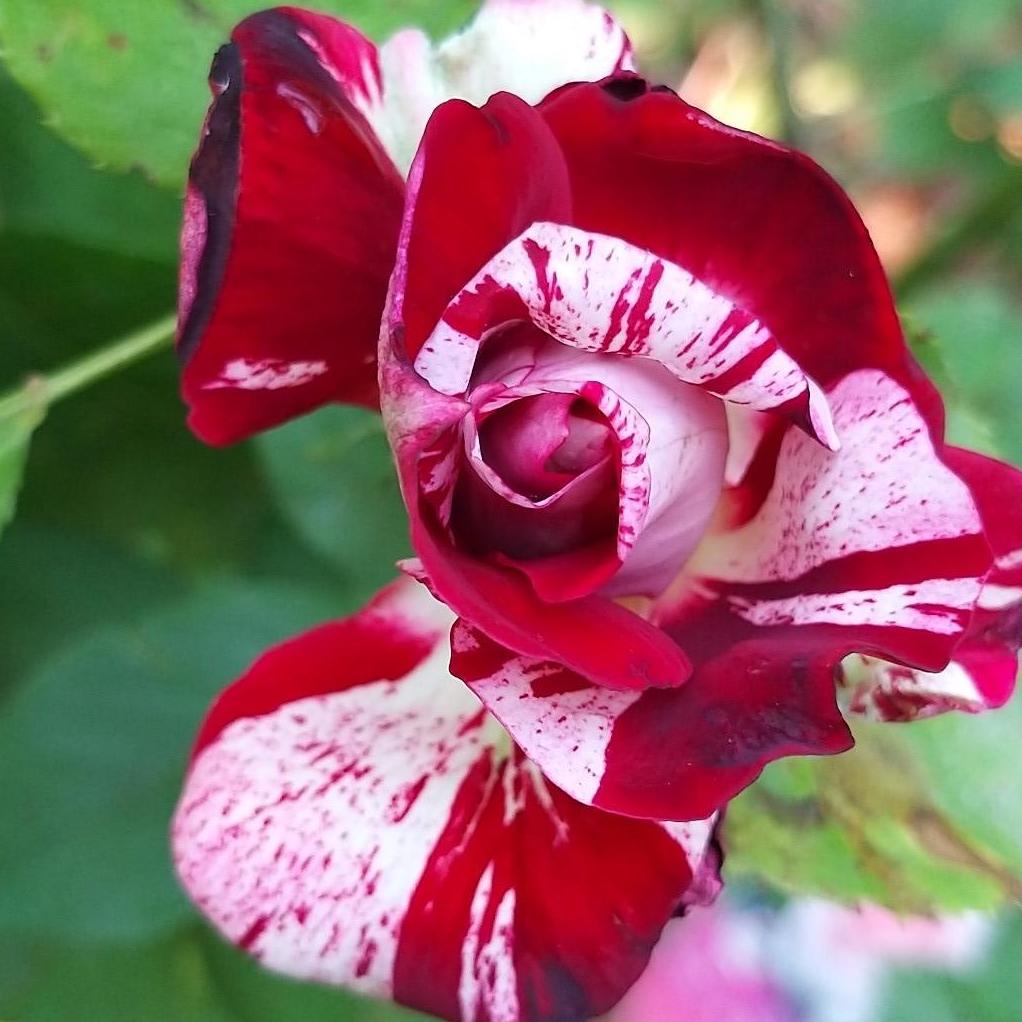 Esta variedad híbrida forma parte de la familia de los híbridos de té o rosales de grandes flores. Con un crecimiento rápido, forma una planta con una vegetación densa, de porte compacto, que puede alcanzar una altura de 0,70 a 0,80 m y un ancho de 0,50 a 0,60 m. Este arbusto se caracteriza por ramas sólidas y espinosas que soportan un follaje denso cortado en hojas anchas dentadas de un verde oscuro satinado, añadiendo así un hermoso aspecto ornamental a la planta. De mayo-junio a octubre, ofrece una floración generosa y continua. Los capullos florales de un tono violáceo se abren en hermosas flores de 10 a 11 cm de diámetro, compuestas por 40 a 50 pétalos, que recuerdan la forma característica de los híbridos de té. Para mantener una floración continua, se recomienda eliminar regularmente las flores marchitas. Sus flores suelen agruparse por 2, 3 o incluso 5 en el extremo de un largo y sólido tallo espinoso ideal para la flor cortada. Los pétalos, cuyo color dominante es el rojo magenta, están más o menos moteados y rayados de blanco crema. Las rosas emiten un intenso aroma con notas exóticas de cítricos y Verbena de la Patagonia.